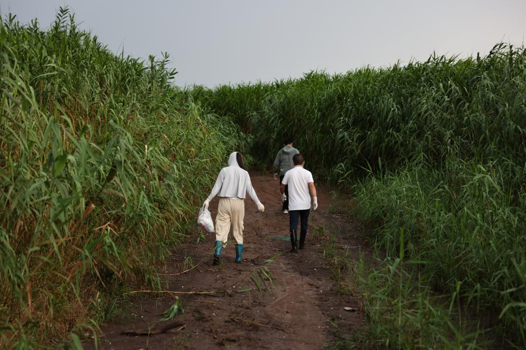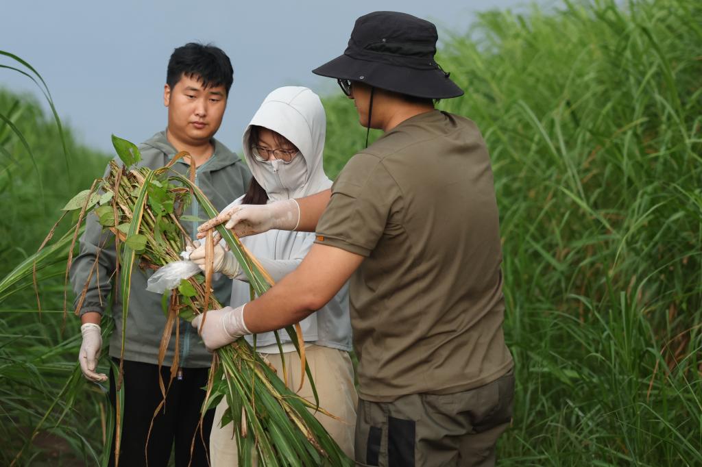 ↑7月9日,中国科学院洞庭湖湿地生态系统观测研究站科研人员在湖南东洞庭湖国家级自然保护区将采集的植物样本捆好,以便带回实验室。