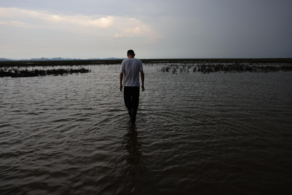 ↑7月9日,中国科学院洞庭湖湿地生态系统观测研究站巢传鑫博士在湖南东洞庭湖国家级自然保护区涉水前往样地。