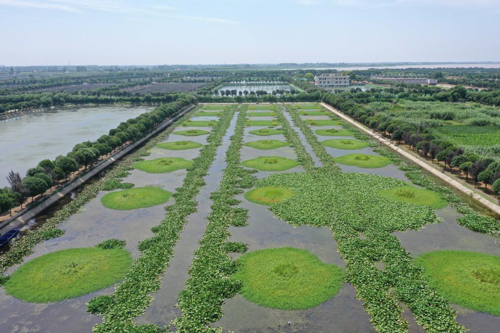 ↑这是7月10日在湖南省益阳市大通湖区拍摄的水生植物产业示范园(无人机照片)。
