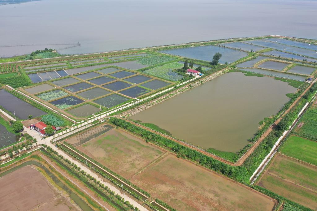 ↑这是7月10日在大通湖区河坝镇沙堡村拍摄的由中国科学院设计的大通湖流域农业面源污水末端强化处理设施(无人机照片)。