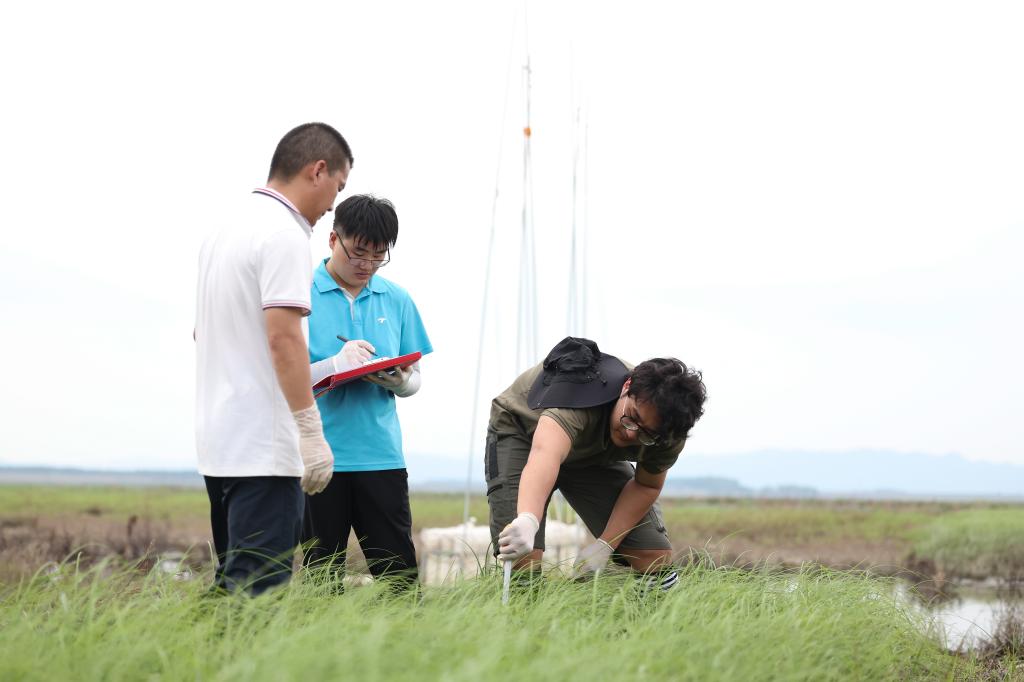 ↑7月9日,中国科学院洞庭湖湿地生态系统观测研究站科研人员在湖南东洞庭湖国家级自然保护区准备采集植物样本。