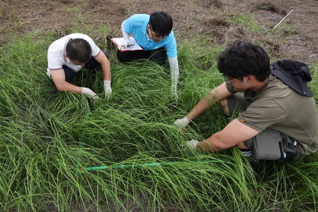 ↑7月9日,中国科学院洞庭湖湿地生态系统观测研究站科研人员邹业爱博士(左)和学生在湖南东洞庭湖国家级自然保护区采集苔草样本。