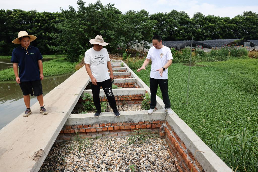 ↑7月10日,谢永宏(右)在湖南省益阳市大通湖区河坝镇沙堡洲村一处牛蛙养殖基地,向养殖主介绍由他们设计的“三池两坝”养殖尾水处理设施。