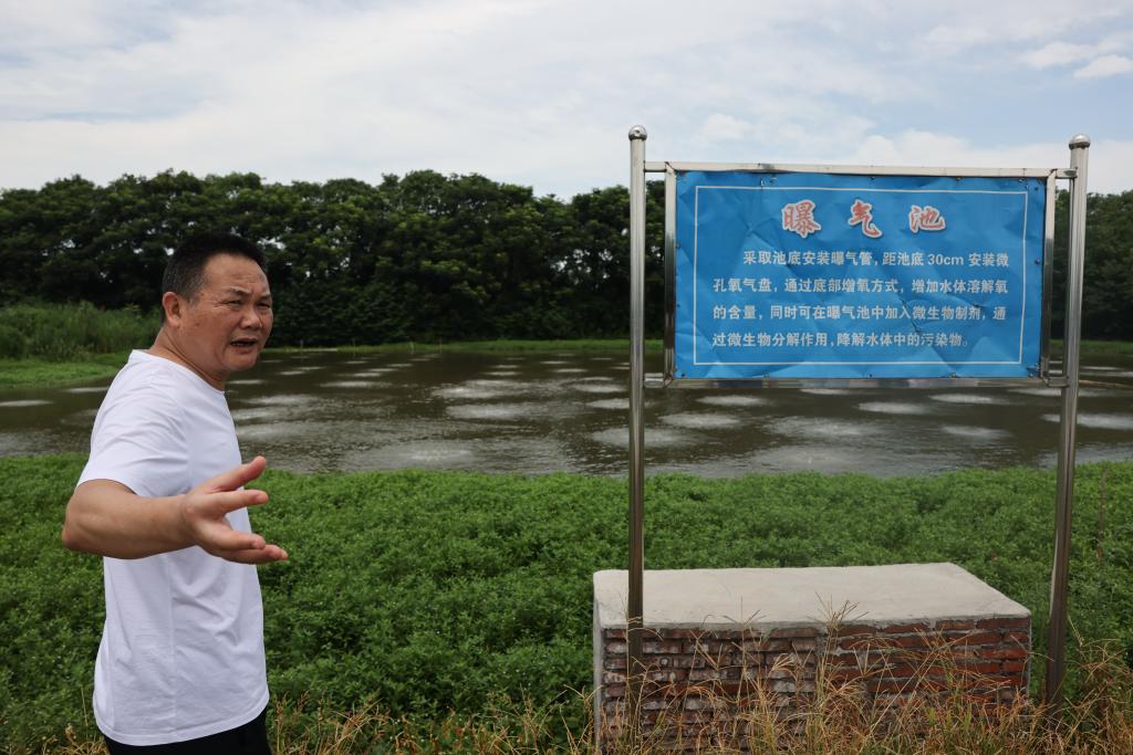 ↑7月10日,谢永宏在湖南省益阳市大通湖区河坝镇沙堡洲村一处牛蛙养殖基地,介绍由他们设计的“三池两坝”养殖尾水处理设施。