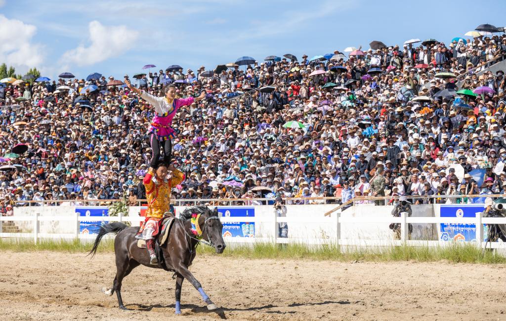 8月17日,2023拉萨雪顿节赛马大会现场,两位骑手正在进行单马双人表演。新华社记者 丁增尼达 摄
