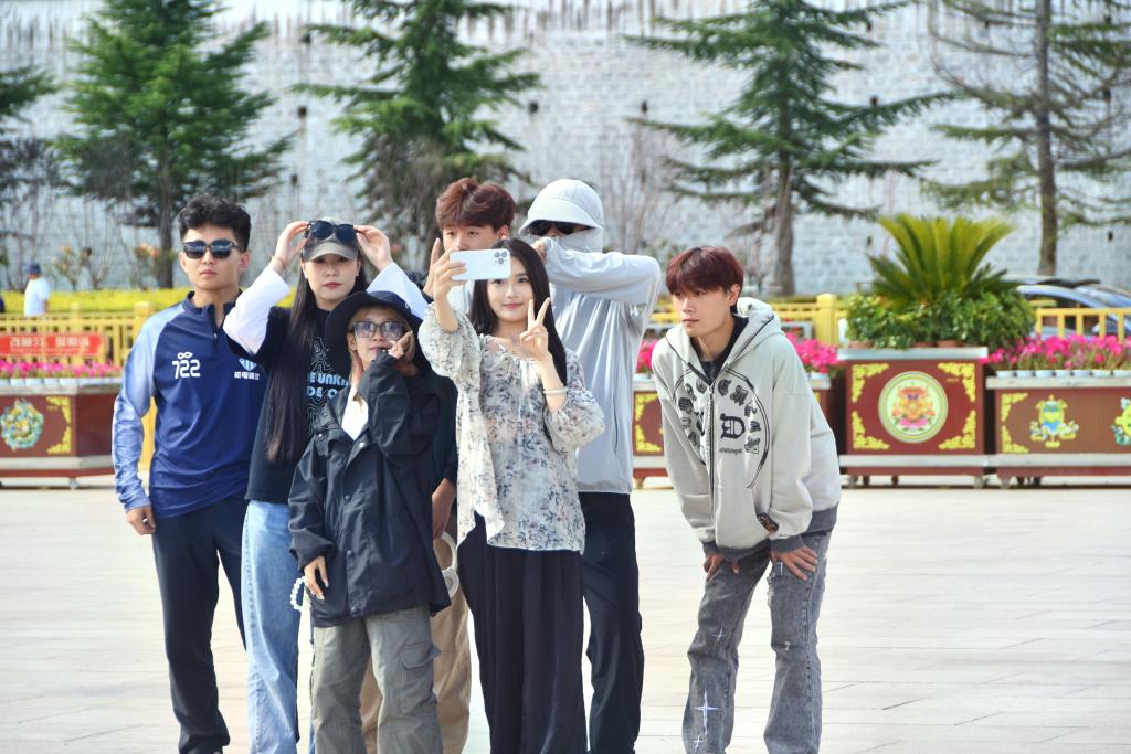 8月17日,布达拉宫广场,游客们拍照留念。新华社记者 刘文博 摄