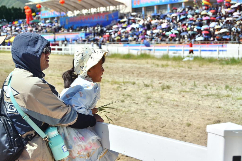 8月17日,2023拉萨雪顿节赛马大会现场,一位父亲带着女儿来看比赛。新华社记者 刘文博 摄