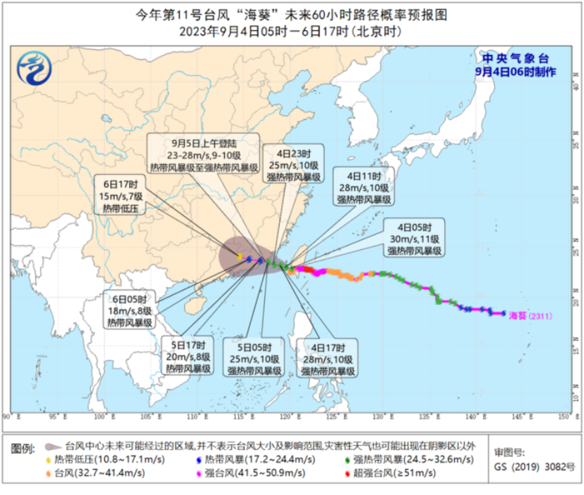 中央气象台9月4日06时发布台风黄色预警:今年第11号台风“海葵”(HAIKUI)的中心已于昨天(3日)晚上7点50分前后移入台湾海峡南部海面,晚上8点钟由强台风级减弱为台风级,今天(4日)早晨5点钟进一步减弱为强热带风暴级,其中心早晨5点钟位于台湾省高雄市近海海面,中心附近最大风力有11级(30米/秒),中心最低气压为975百帕。预计,“海葵”将以每小时10公里左右的速度向西偏北方向移动,逐渐向闽粤交界一带沿海靠近,并将于5日上午在福建漳浦至广东惠来一带沿海登陆(热带风暴级到强热带风暴级,23-28米/秒,9-10级),登陆后向偏西方向移动,强度逐渐减弱(见图1)。