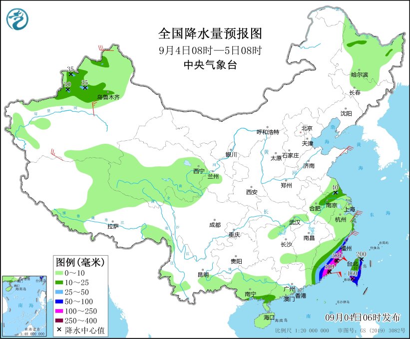 9月4日08时至5日08时,福建南部和东部、广东东部、浙江东南部、台湾岛大部等地有大到暴雨,其中,福建东部、广东东北部、台湾岛东北部和西南部等地部分地区有大暴雨,福建东南部沿海局地特大暴雨(250~300毫米)。浙江、福建东部等地有4-6级大风;东海南部海域、台湾以东洋面、台湾海峡、巴士海峡、南海东北部和中东部海域、南海南部海域、北部湾将有6~8级、阵风9~10级的大风(见图4)。