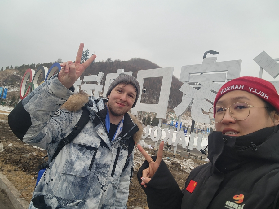 郑白在崇礼与英国籍嘉宾安德瑞录制视频