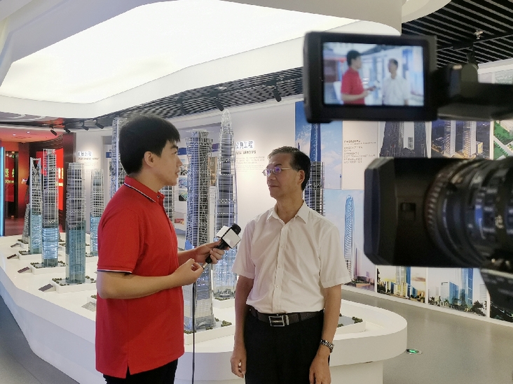 2021年9月,深圳钢结构博物馆,贺子桓正在采访全国道德模范、中国好人陆建新。
