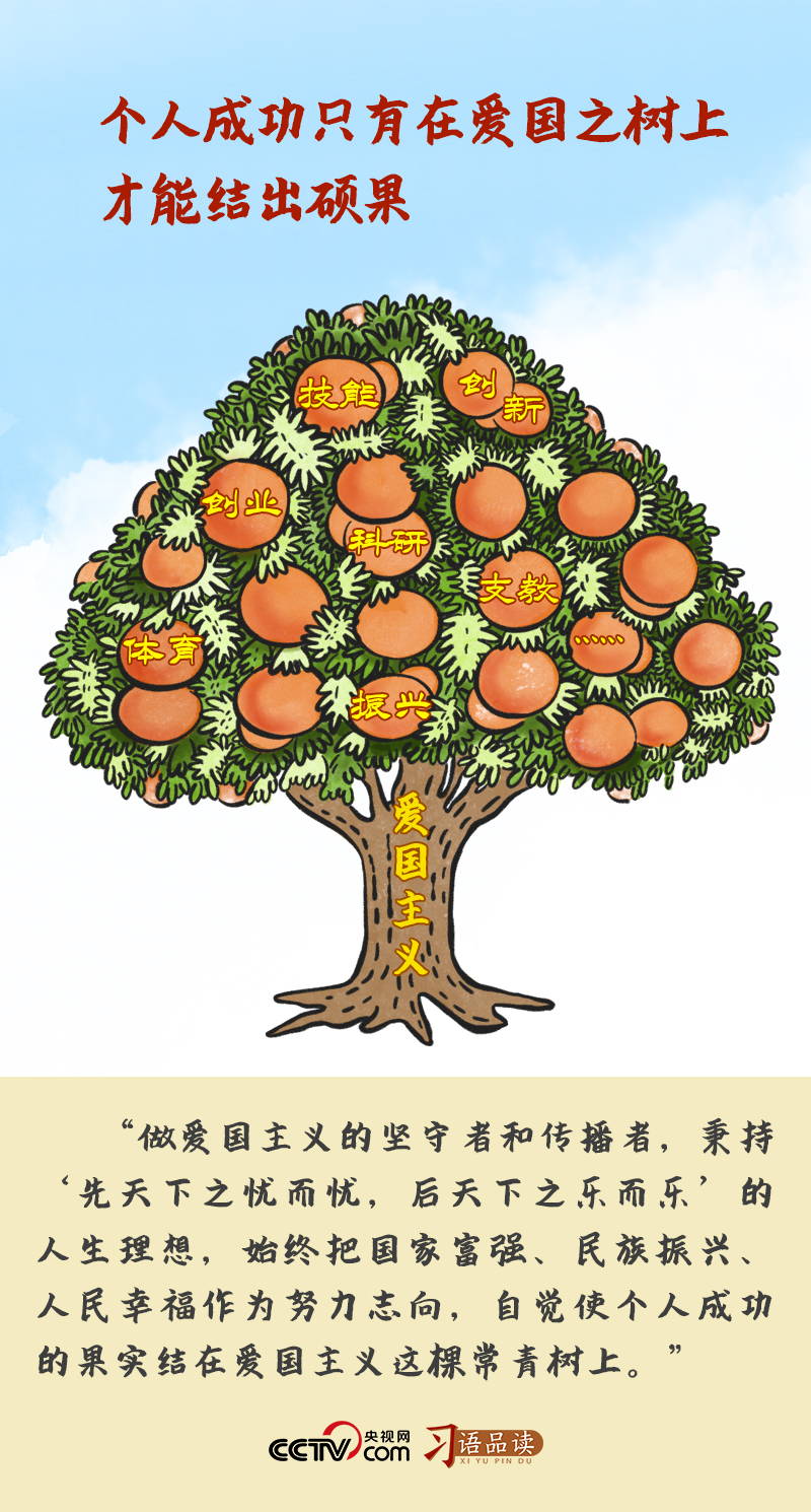 “常青树”象征着国家和社会的大环境,“果实”代表了个人在此环境中所取得的成就和价值。“成功之果”不能凭空而降,而是要实实在在结在“爱国主义”这棵“常青树”上。习近平总书记用“果与树”之喻,质朴生动地阐释了个人与国家的联系。