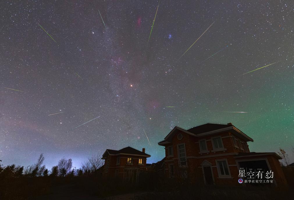 黑龙江省天文摄影爱好者刘成山2021年10月21日在黑龙江金龙山国家森林公园拍制的猎户座流星雨(多张叠加)。(本人供图)