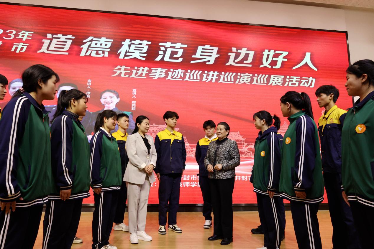 4月4日,全国道德模范郭建华在“道德模范巡讲”活动现场与学生们亲切交流。(开封市文明办供图)