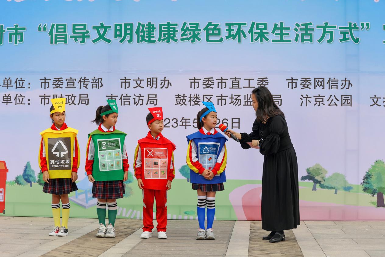5月26日,小学生身穿垃圾分类道具服装,在“推动垃圾分类成为低碳生活新时尚”活动现场进行教学演示。(开封市文明办供图)