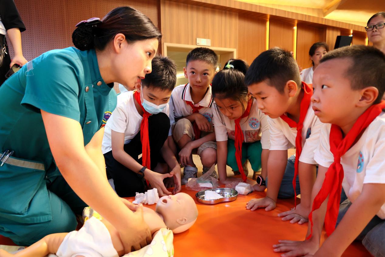 7月25日,小学生们在“小小急救员”公益培训活动上进行心肺复苏模拟练习。(开封市文明办供图)