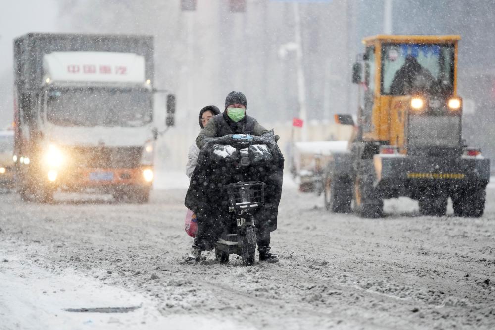 11月6日,哈尔滨市民在风雪中骑车出行。新华社记者 王建威 摄