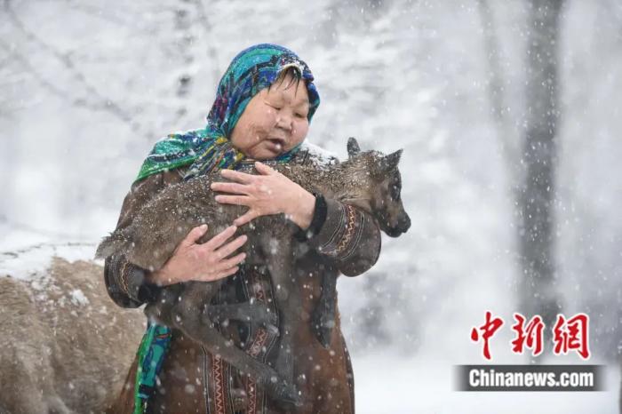 2023年5月1日,内蒙古大兴安岭,柳霞在雪中怀抱一头刚出生不久的驯鹿幼崽。王伟 摄