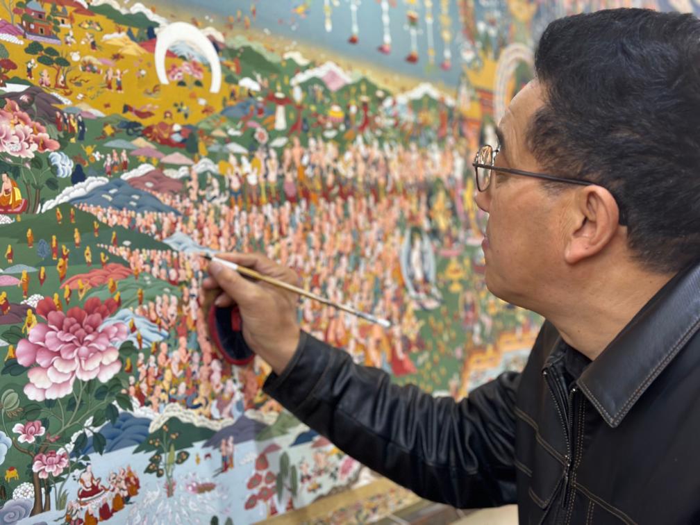 笔在不到1厘米的菩萨脸上划过,轻得不见着色,几笔过后,一个由棕渐变到淡黄的下颌线渐渐出现了。这张长约3.5米、高近2米的画布上分布着2023位人物,最小不及一粒青稞,60岁的非遗传承人曲久已经画了3年,还要一年多才能完成。