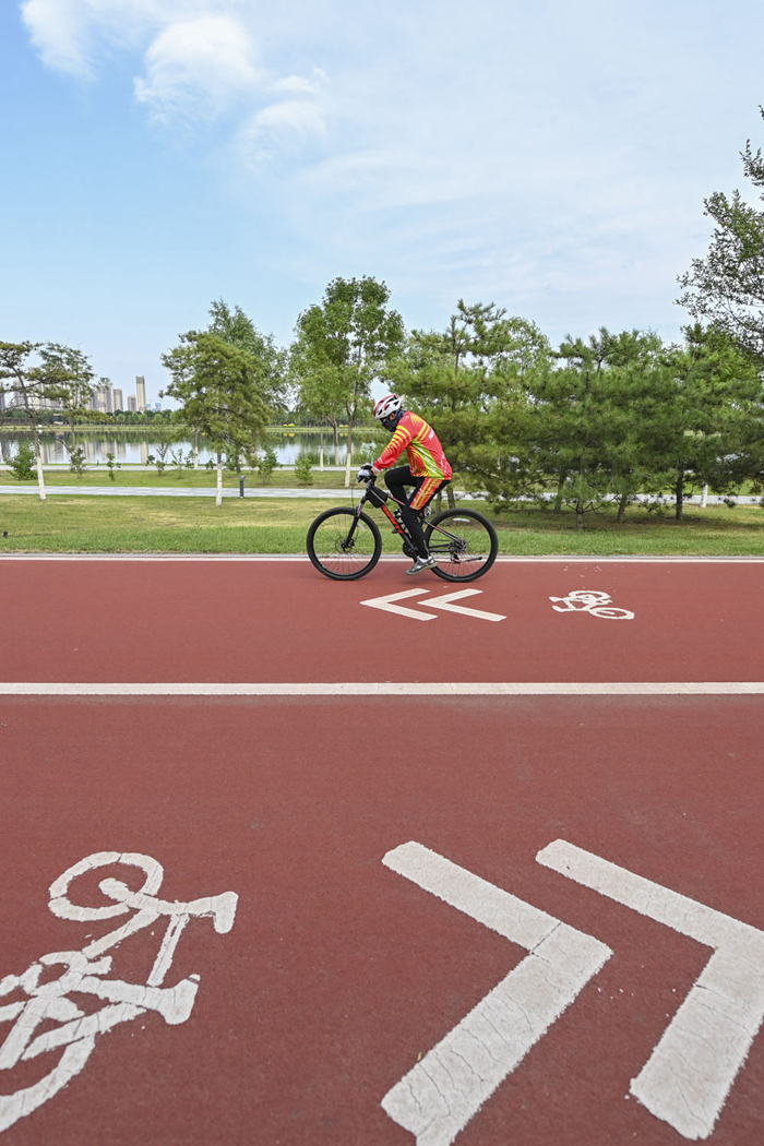 市民在山西省太原市汾河公园内骑行(2023年6月27日摄)。新华社记者 杨晨光 摄