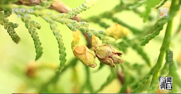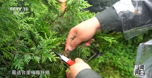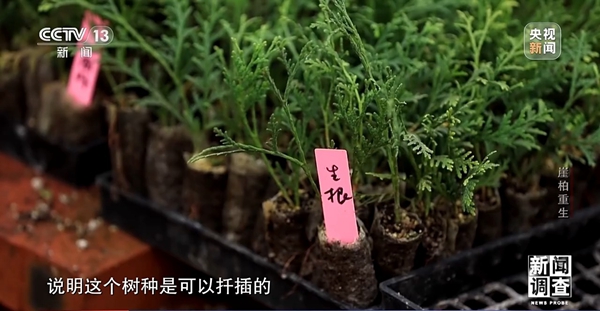 中国林科院森林生态环保所二级研究员 郭泉水:一个偶然的机会,从崖柏的小树上采集了一些穗条然后进行扦插,在同样的条件下,它的生根率达到了96%,说明这个树种是可以扦插的。