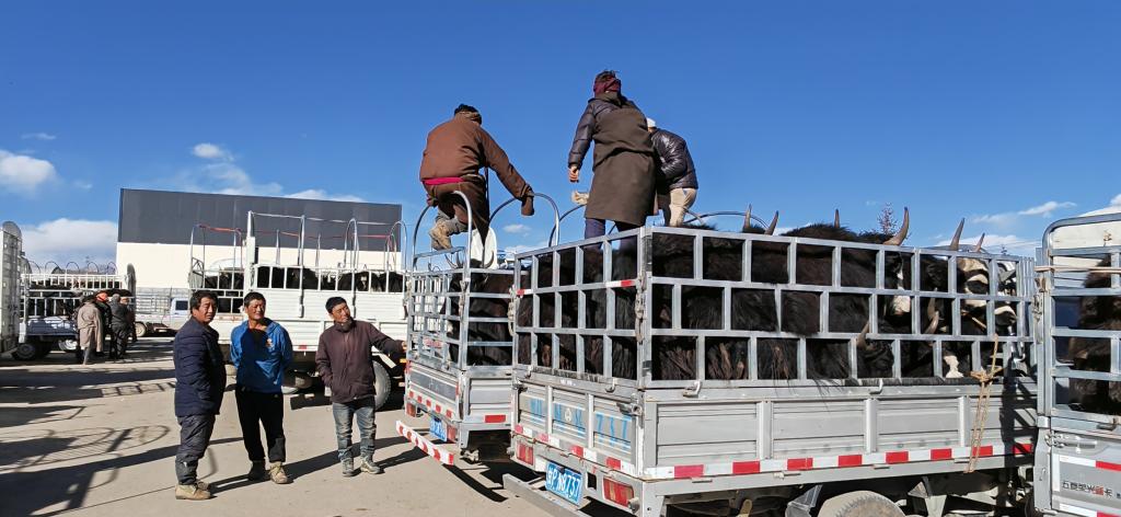 经验老到的马海明,最中意位于甘肃省甘南藏族自治州玛曲县的活畜交易市场。“这里的牛羊品质好,在牧区远近闻名。每年开市都会吸引各地客商前来交易。高峰时,我每天都能在这里收购到100多头牦牛。”他说。