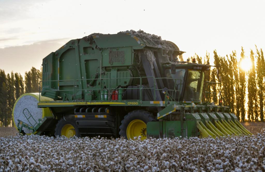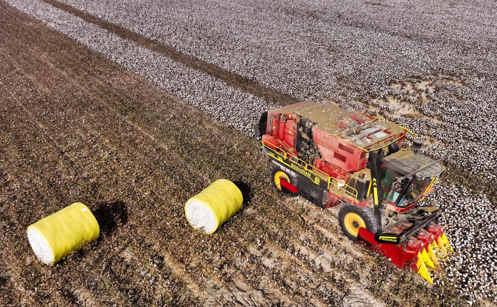 轰隆隆的采棉机以五六公里时速行进在棉田中,将白色的棉花通过采棉头收入集棉箱,自动打包成一个个重约2吨的棉包留在田里。
