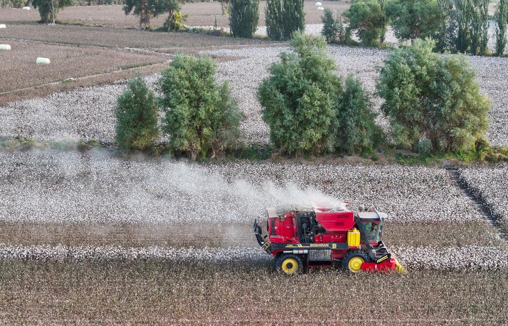 在新疆,农机手驾驶采棉机在棉田中作业(10月24日摄,无人机照片)。新华社发(李飞摄)