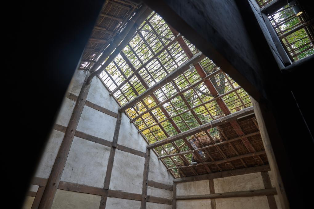 这是12月19日在成都杜甫草堂茅屋故居拍摄的拆除了旧茅草后的屋顶。新华社记者 薛晨 摄