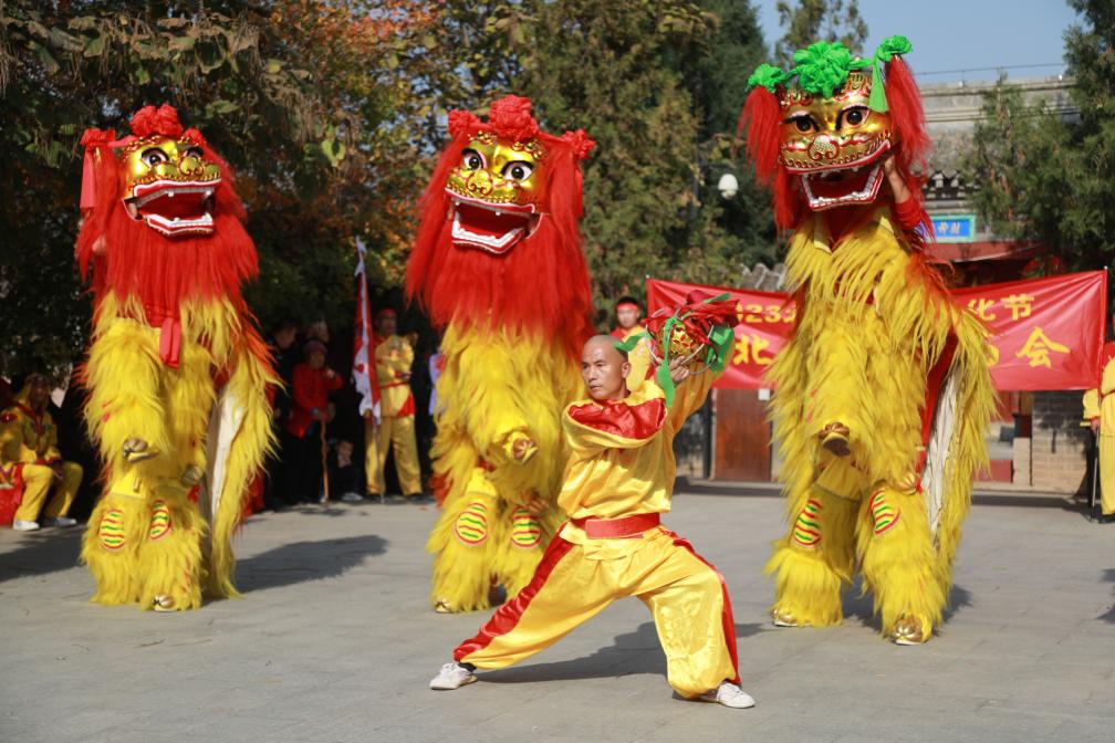 10月28日,古北口长城庙会上的舞狮表演。新华社记者夏子麟 摄
