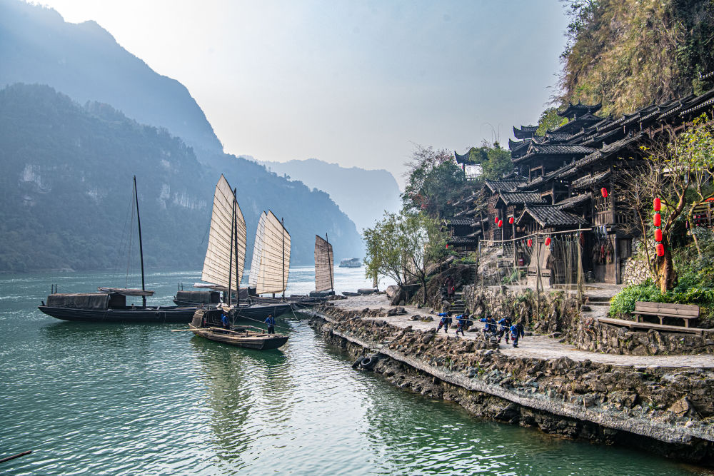 在西陵峡境内的“三峡人家”龙津溪景区,吊脚楼点缀于山水间,帆船停泊在溪口处,“纤夫”们喊着古老的峡江号子,灵动的小桥流水,独具韵味的民俗风情,令一路“扁舟下三峡”的游人们流连忘返。