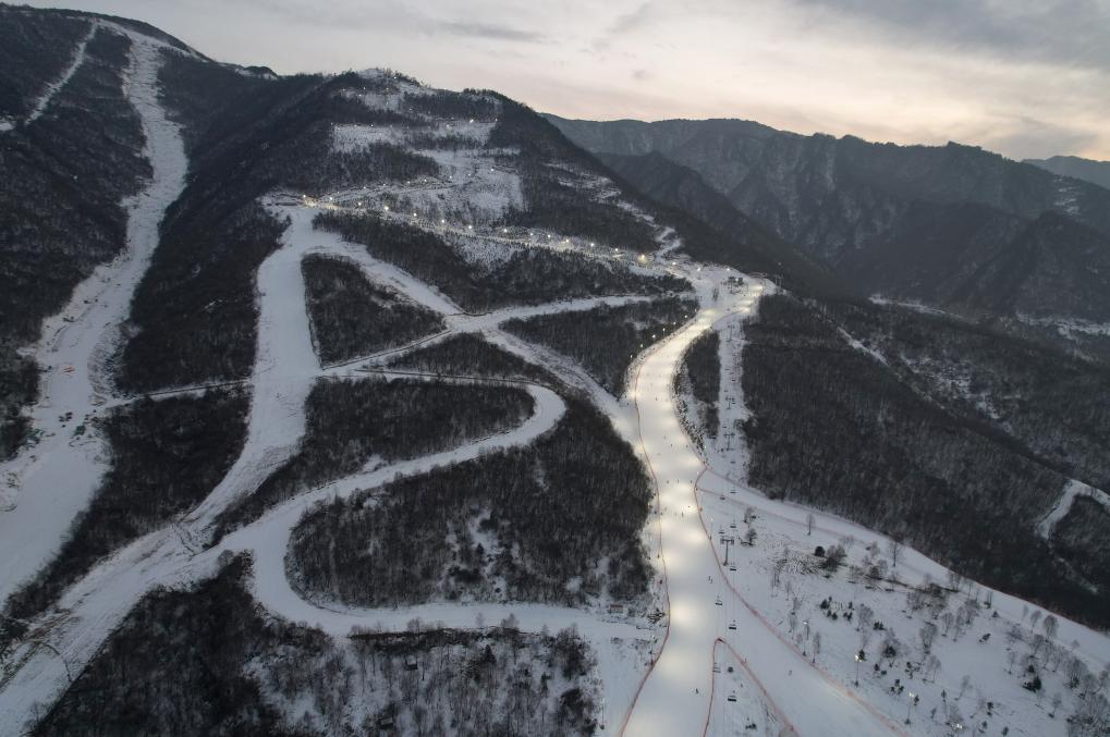 2016年投入运营的陕西省宝鸡市太白县鳌山滑雪场(2022年2月14日摄,无人机照片)。新华社记者 邵瑞 摄