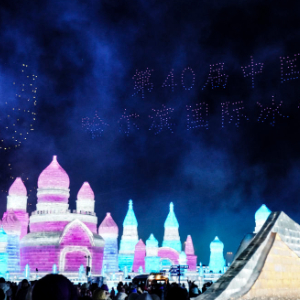 2024年1月5日,在哈尔滨冰雪大世界园区,游客观看哈尔滨国际冰雪节开幕式上的无人机表演。新华社记者 王建威 摄