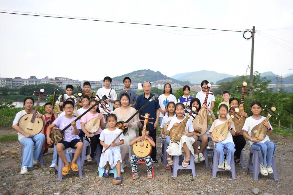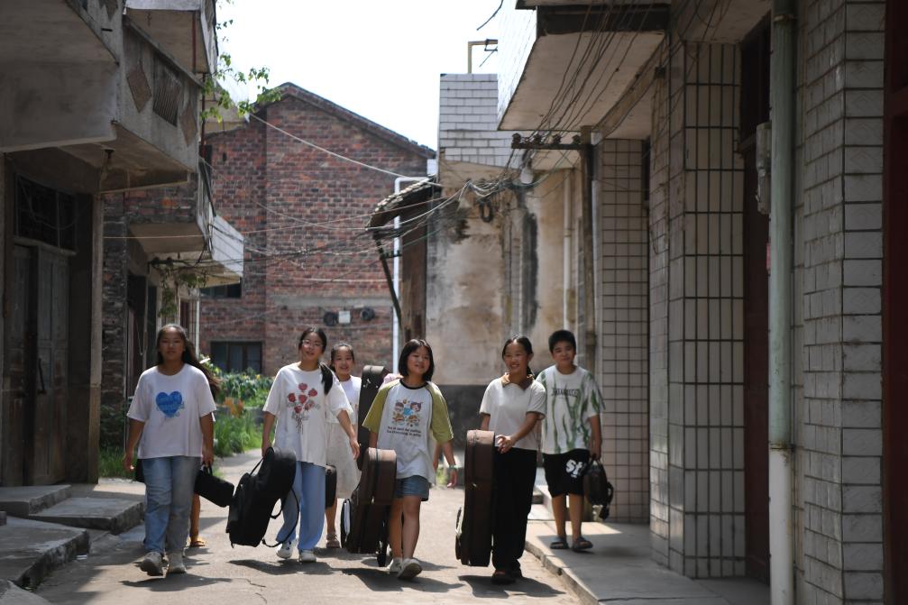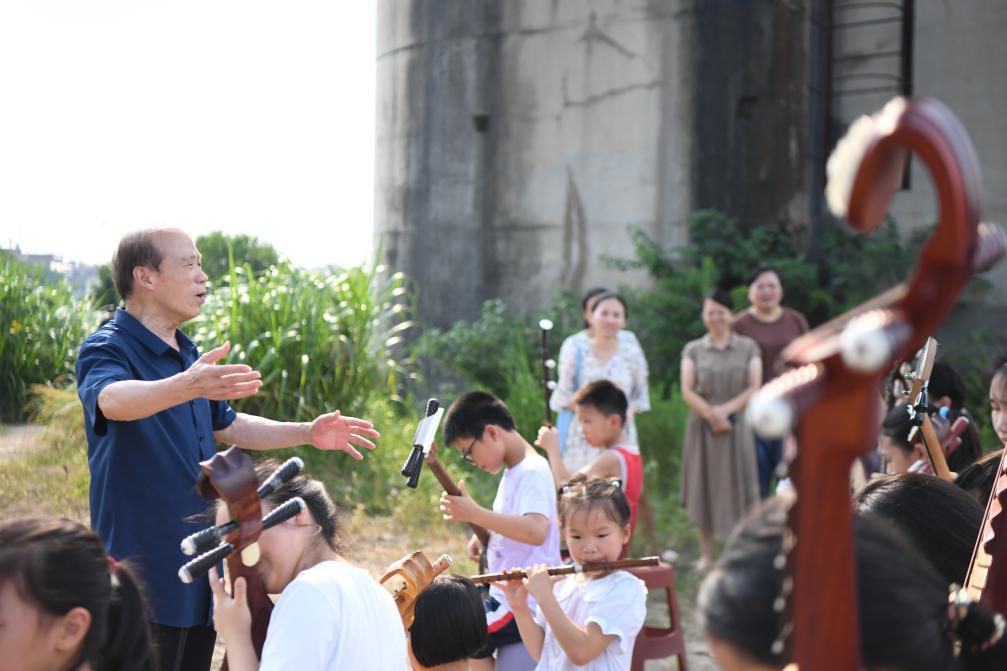 ↑ 2023年8月12日,李舒尤(左一)在枧头洲村户外指挥学生们合奏。