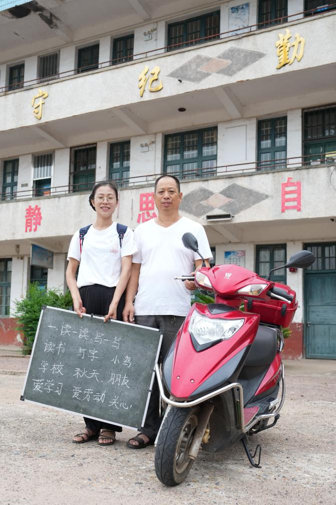 认识第二位老师是在9月。当时我得到一个线索,在湖南省茶陵县,31岁的陈艳辉老师从2016年起坚持为义务教育阶段的适龄重度残疾儿童“送教上门”。2018年,陈艳辉的父亲陈二文也申请加入了送教队伍。从此,一块小黑板,一个装满教具、教材、零食的小书包,一辆摩托车,数万公里的送教路上,父女俩奔走在乡间小路的匆匆身影,成为乡亲们眼中一道温馨的风景线。乡亲们说:“这是摩托车上的小课堂。”赶在教师节前夕,我和同事前往陈艳辉和陈二文所在的界首镇采访。