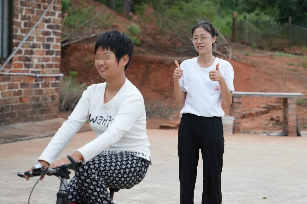 ↑ 2023年9月7日,陈艳辉(右)在湖南省株洲市茶陵县界首镇贺铺村的小静家中带小静骑单车。小静先天智力障碍,对运动十分感兴趣,陈艳辉和陈二文常带她跳绳、骑单车。