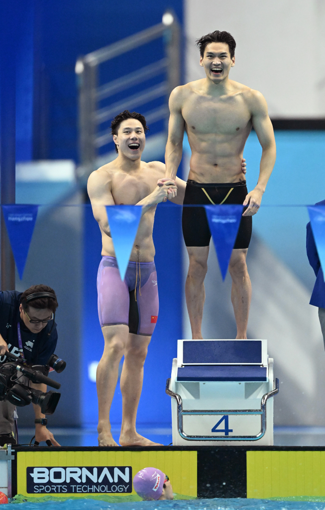 ↑ 2023年9月26日,中国选手徐嘉余(右)与覃海洋庆祝夺冠。 当日,在杭州亚运会男子4X100米混合接力决赛中,中国队获得冠军。