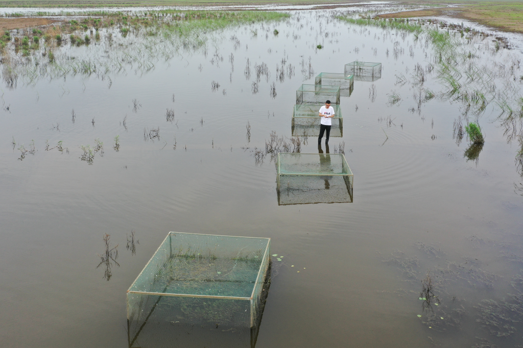 ↑ 2023年7月9日,中国科学院洞庭湖湿地生态系统观测研究站科研人员巢传鑫博士在湖南东洞庭湖国家级自然保护区查看种植的沉水植物生长情况。