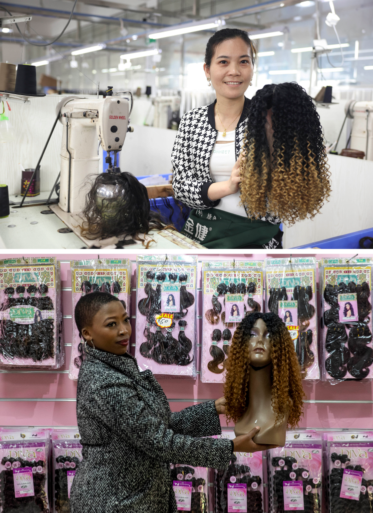 ↑ 拼版照片:上图为2023年5月25日,工人在湖南邵阳美丽来发制品有限公司车间内展示假发(新华社记者薛宇舸摄);下图为2023年6月9日,一名店员在湖南邵阳美丽来发制品有限公司位于南非约翰内斯堡的店铺内展示假发(新华社记者张誉东摄)。