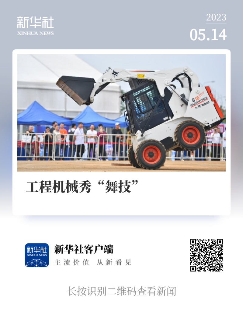 ↑ 2023年5月13日,在长沙国际工程机械展览会上,机手驾驶挖掘机“比心”。