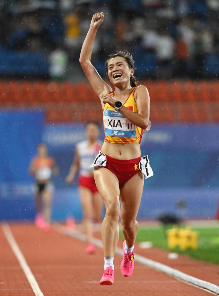 2023年8月1日,夏雨雨在冲刺后庆祝胜利。当日,在成都第31届世界大学生夏季运动会田径项目女子10000米决赛中,中国选手夏雨雨以33分48秒35的成绩夺得冠军。
