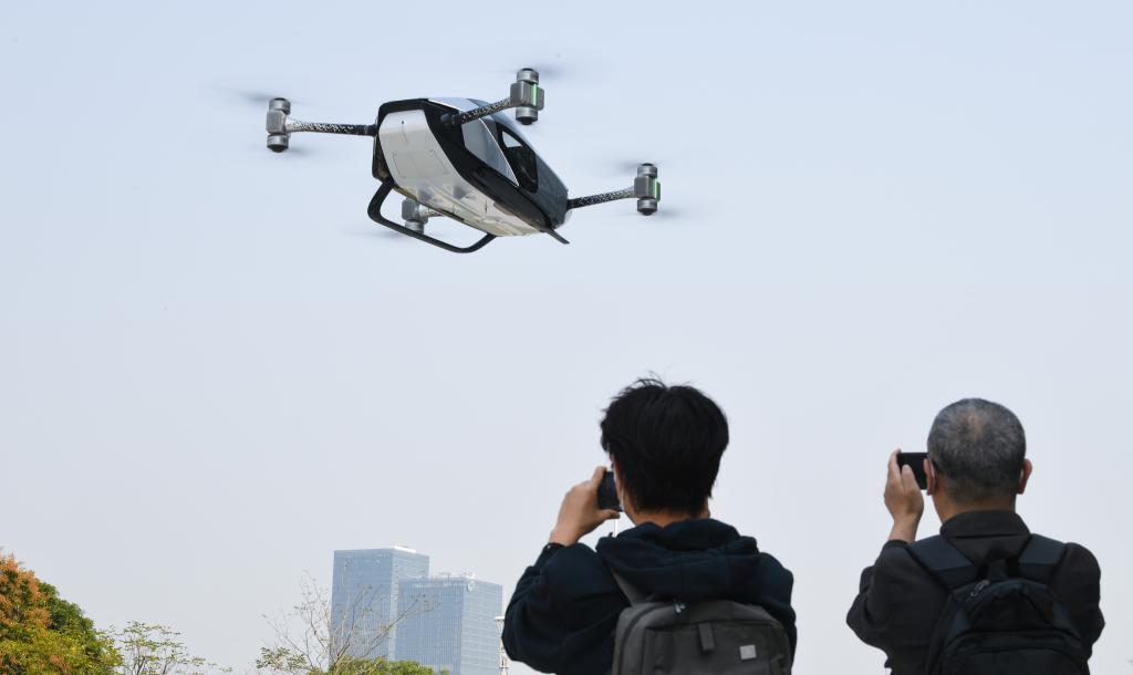 在广州市番禺区小鹏汇天总部,参观者观看飞行汽车旅航者X2飞行演示(2023年2月24日摄)。