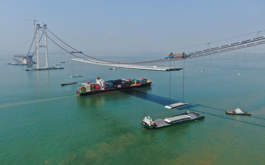 2023年2月22日,集装箱货轮通过正在吊装钢箱梁的深中通道伶仃洋大桥。