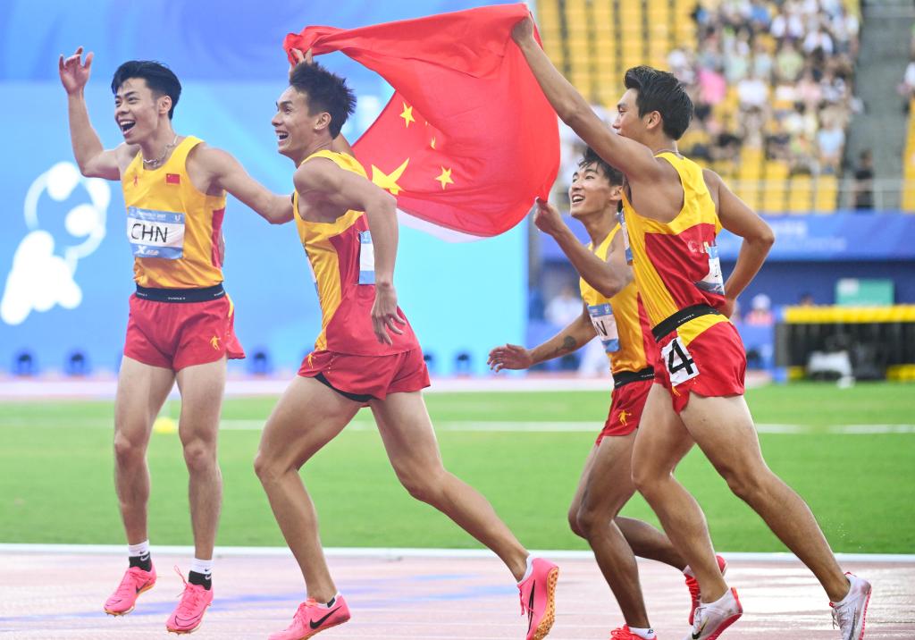 2023年8月6日,中国队选手陈佳鹏(右后)、陈冠锋(左一)、邓智舰(右前)、严海滨(左二)在赛后庆祝。当日,在成都举行的第31届世界大学生夏季运动会田径项目男子4x100米接力决赛中,中国队以38秒80的成绩获得冠军。