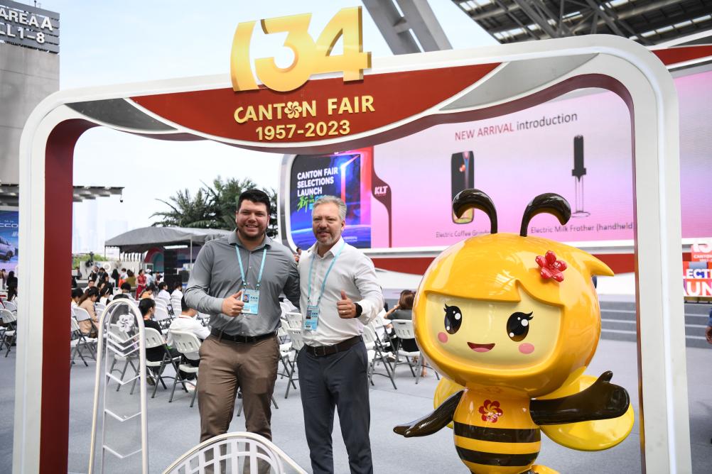2023年10月15日,来自巴西的采购商在广交会上合影。