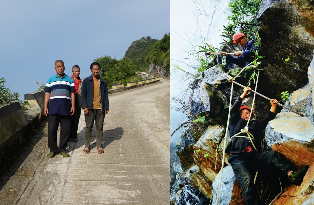 ↑ 拼版照片:左图为李华明(左)、杨运富(中)和李光才一起在他们修好的出村路上合影(2023年7月26日摄);右图为2008年李华明(下)和同伴在修路时在悬崖上打炮眼的资料照片(西畴县融媒体中心供图)。
