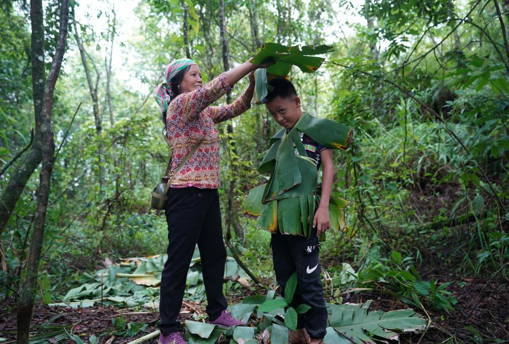 ↑ 张普忠的老伴王素英(左)用芭蕉叶给孙子制作“衣服”(2023年7月23日摄)。