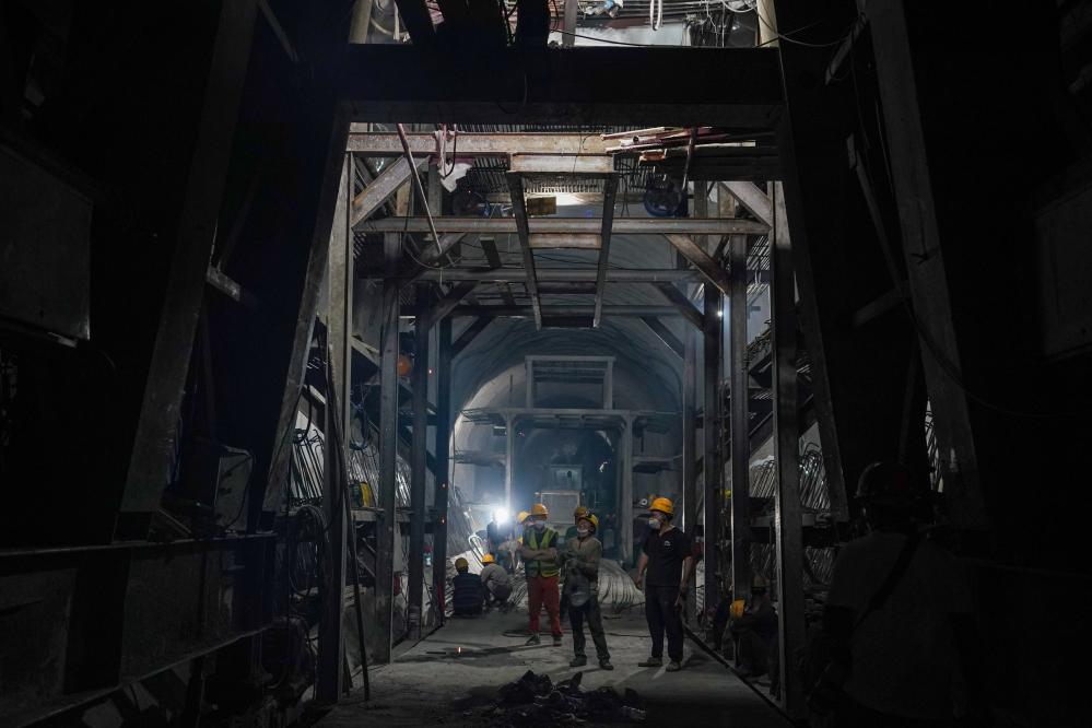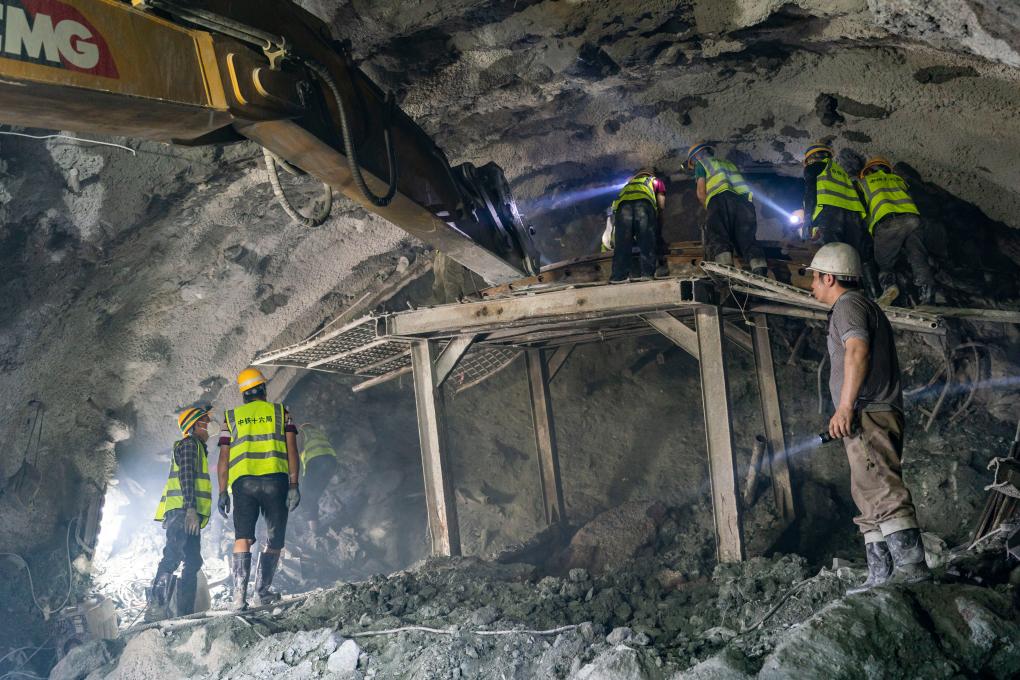 ↑ 工人在哈巴雪山隧道内施工(2022年7月27日摄)。