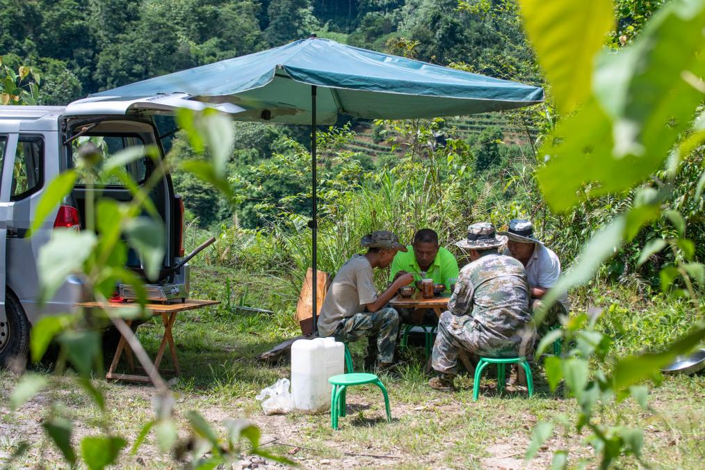 ↑ 刁发兴(左二)和监测队队员在“生活车”旁用餐(2023年7月20日摄)。