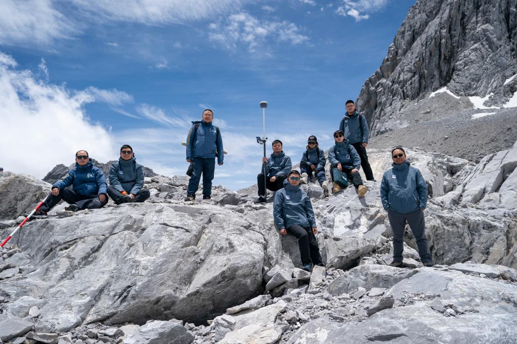 ↑ 玉龙雪山站站长王世金(右一)带领团队成员与前来参加调研学习的滇西应用技术大学师生在玉龙雪山上合影留念(2023年6月16日摄)。